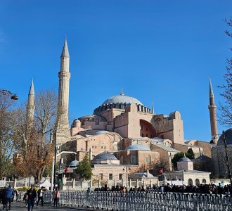 Exterior: From first approach towards Hagia Sophia from the beautiful Sultanahmet Park you’ll notice the towering and large dome surrounded by a series by four minarets and a pathway that leads you through a series of fountains to the glowing red walls of this incredible wonder.