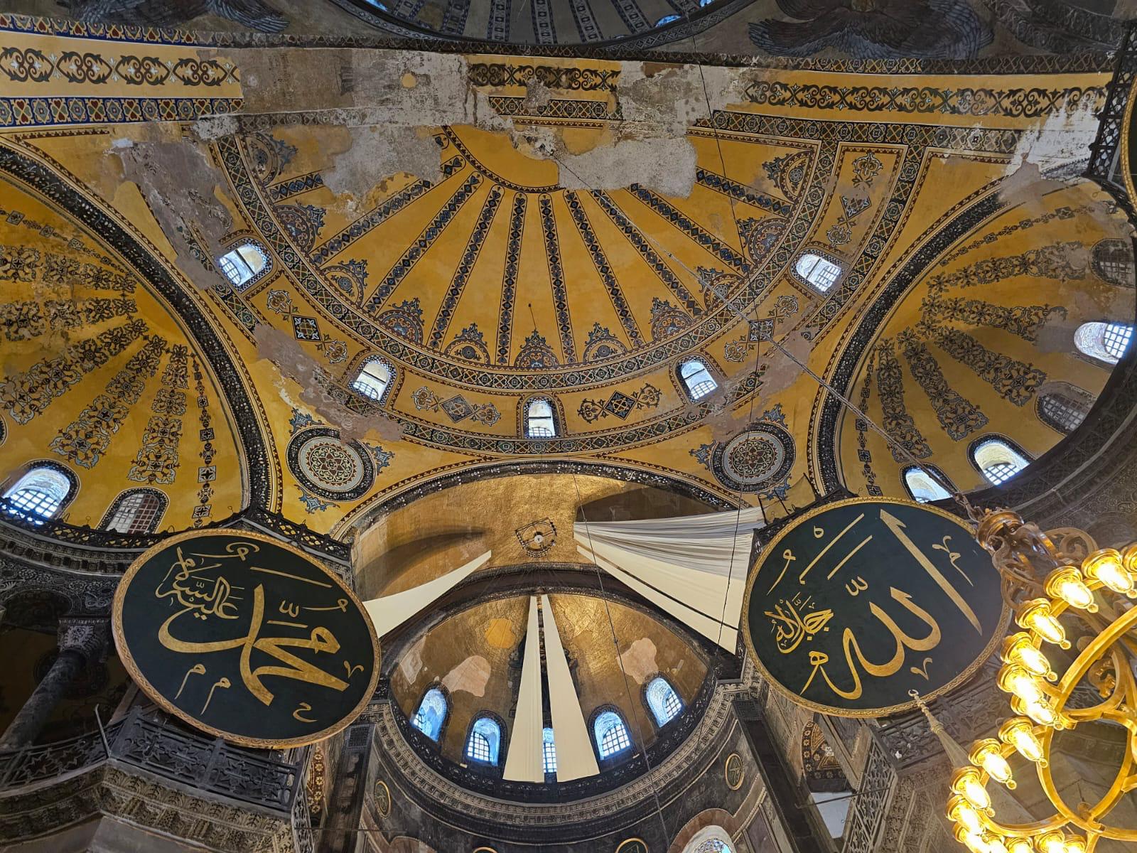 Moving into the interior itself you’ll notice the clash between Christian and Islamic religion and styles – with the mighty gold dome above giving way to a series of Islamic signs and carvings on the interior wall – with the stunning dome whose interior is gold stretching to the highest point inside Hagia Sofia at more than 180 foot.