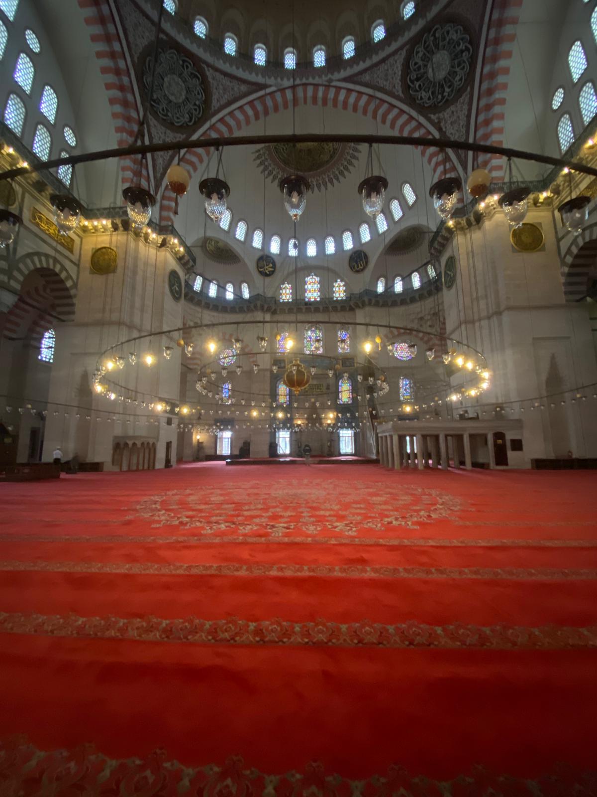 The prayer space itself is dotted with a series of prayer mats – which are constantly being replaced – and which sit on top of a flowing regal red carpet that covers the whole of the interior and you’ll also notice the stunning ceramic tiles – designed in true ottoman style that feature carvings of fruit and flowers – and in particularly tulips, which were said to be one of the favourite flowers of the Sultan – with some of the tiles being noticeably worn away and lost over time.