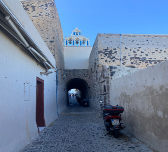 Considered an off the beaten track village – Pygros is not on every explorers list when it comes to sights in Santorini – which helps add not only to the charm but also means less crowds so if your time your visit right you are likely to have the village and the wine to yourself. For those who do venture too Pyrgos and take a moment away from the vineyards, you’ll find a village oozing with charm – with white stone covered houses, the great Venetian castle of Kasteli and a parituclar special spot at the balcony of the Zannos Melathron Hotel – where from atop the highest village in all of Santorini you can enjoy a glass of wine and take in a dazzling Greek sunset.