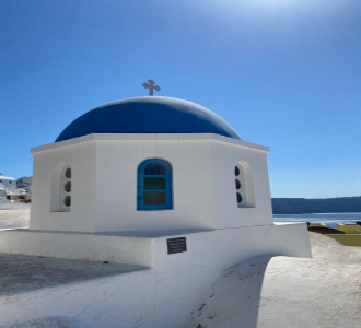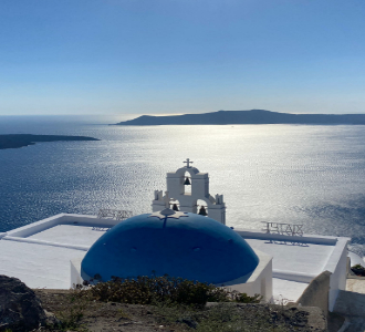 Among the stunning sunset view spots – which include a range of Cycladic balconies, seafront restaurants and idyllic cave spots – you’ll find a stunning trail that leads to the mighty Skaros rock a particularly charming spot – with great views over the blue sea and into the horizon where the volcano awaits you, for those planning a special moment, be sure to get there a little early as once the spot is taken it’s gone. Alongside Skaros – you can also follow the hiking trail down to the Theoskepasti chapel – another romantic and charming spot with stunning architecture and equally stunning views.