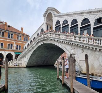 Glass and somewhat slippery bottom, unfortunately the bridge is hated by locals, not only because it doesn’t fit in with the elegant architecture of Venice, but also because it came in over budget and its design by the architect Calatrava is functionally flawed – pushing the banks of the canal away from each other and requiring constant maintenance on the bridge, so much is the hatred for the bridge that Calatrava was fined $80,000 in 2019, which is probably a little harsh.